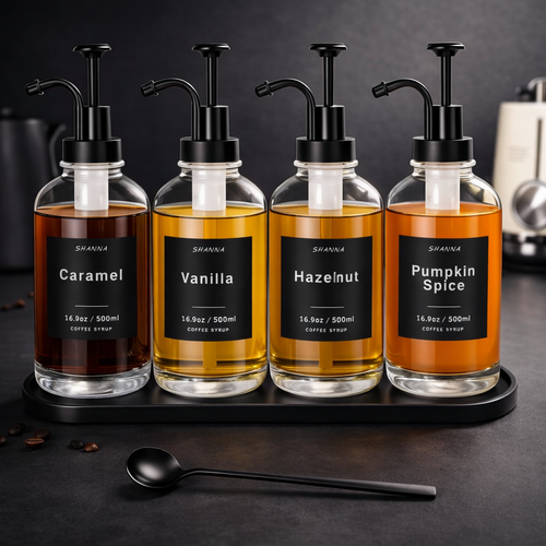 Barista Syrup Dispenser Set – 4 Glass Bottles with Pump, Tray & Labels